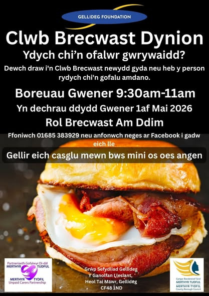 We are very excited to be starting our new Men’s Breakfast Club on Friday May 1st ! Open to all men in Merthyr Tydfil who look after a family member or friend. Have some time out in the company of other men, and enjoy a hearty breakfast bap for free. It’s every Friday morning, 9.30 to 11am at the Centre. Drop us a line or ring to let us know you are coming, with or without the person you care for. See you very soon.